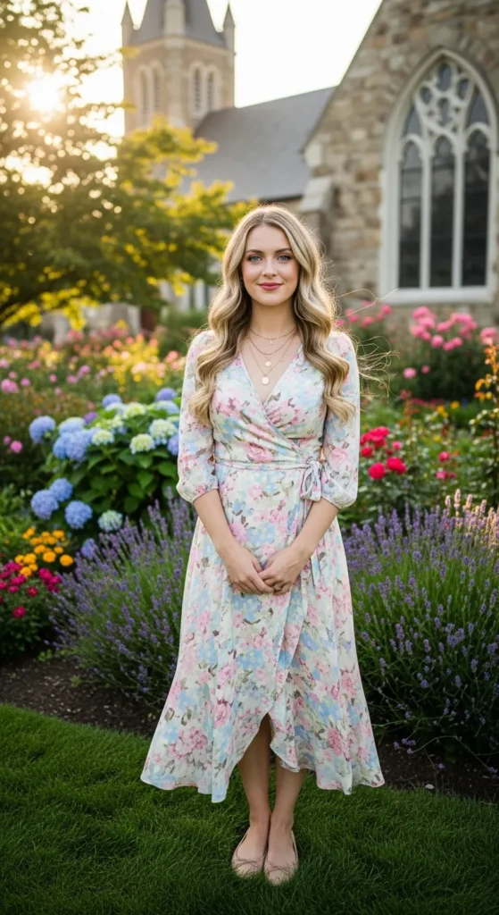 A floral wrap dress brings a romantic, uplifting feel to Sunday dressing. Ballet flats keep it grounded, making the outfit both charming and practical for walking and sitting comfortably.