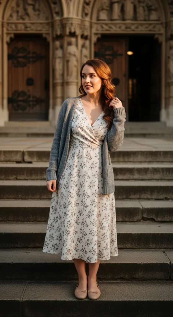 Layering a lightweight cardigan over a midi dress creates a cozy, respectful church outfit. Ballet flats keep everything soft and wearable.