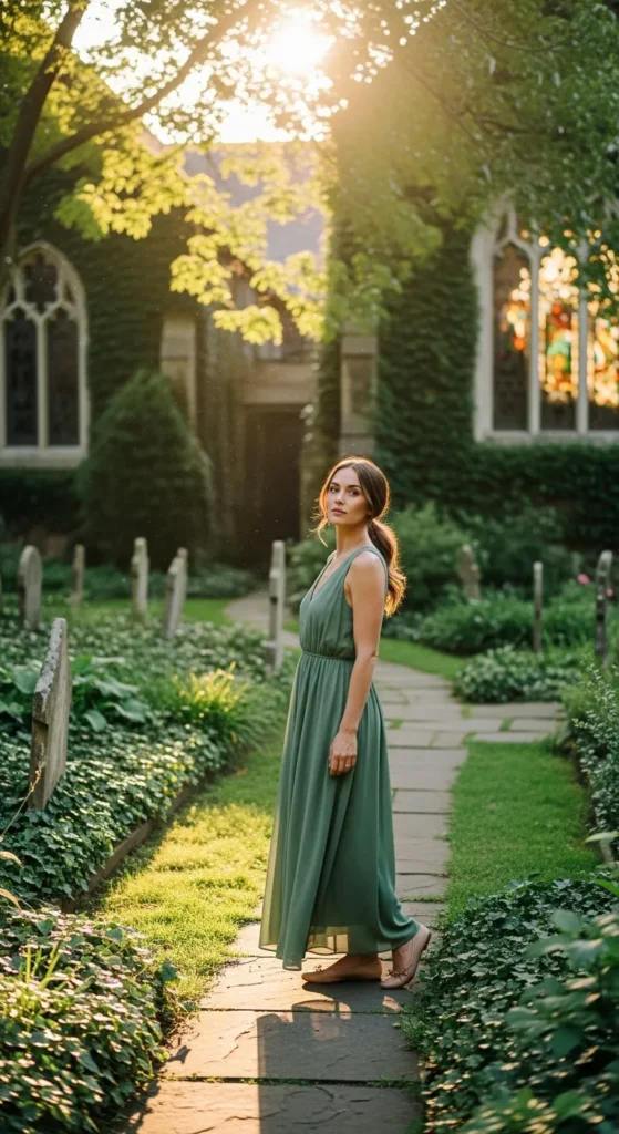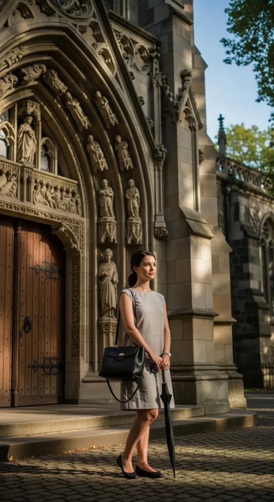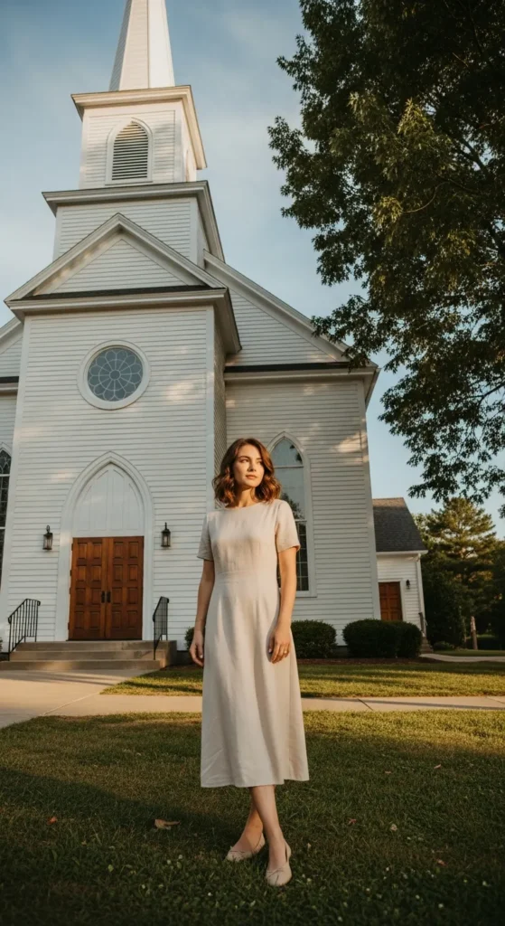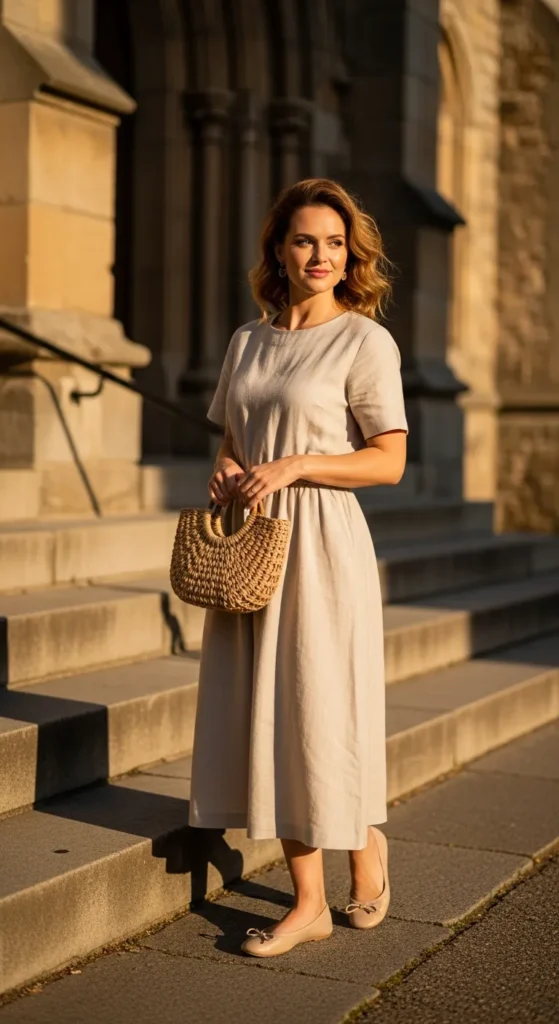 A breathable linen dress in a soft neutral tone feels effortlessly refined and appropriate for a calm church setting. Ballet flats in a matching shade create a cohesive, grounded look that feels airy yet intentional.
