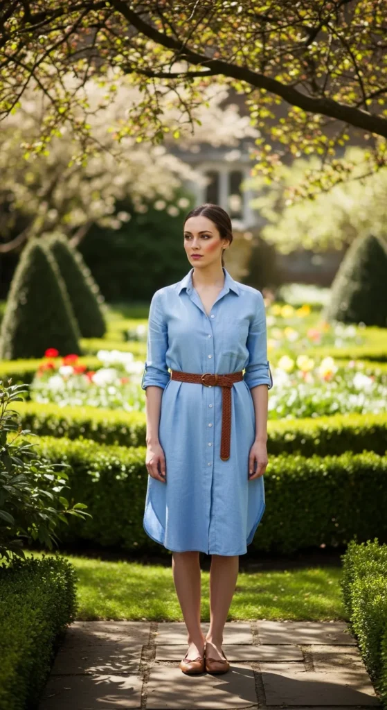 A midi shirt dress is timeless and effortlessly modest. Adding ballet flats keeps the look approachable while maintaining elegance.