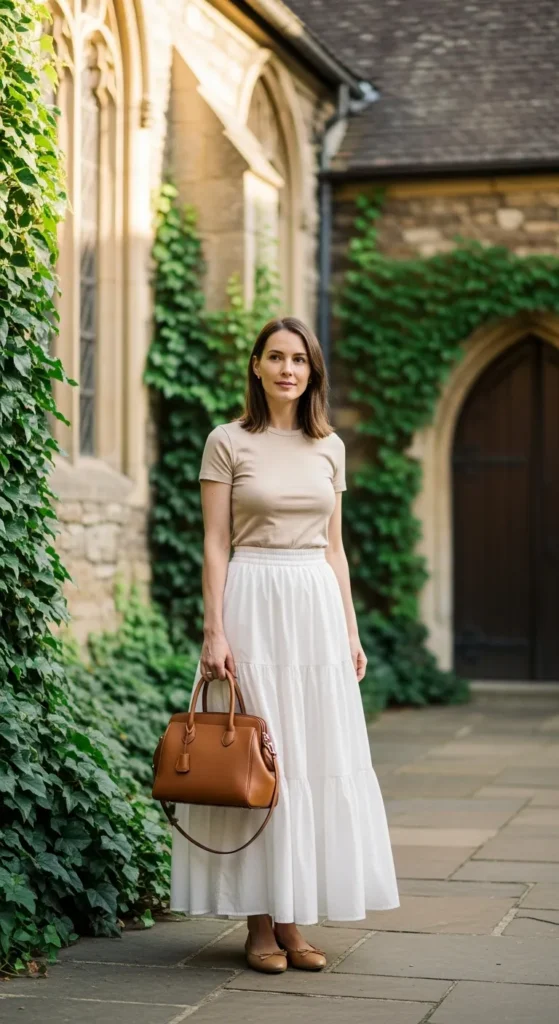 A tiered maxi skirt paired with a simple fitted tee creates a flowy yet structured balance. Ballet flats keep it grounded, allowing the skirt to be the statement.