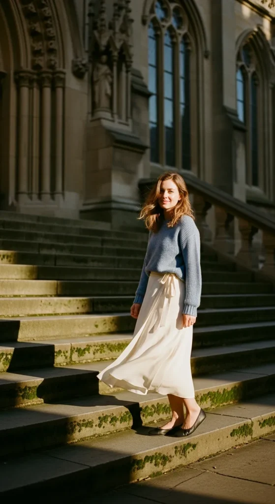 A wrap skirt paired with a lightweight sweater offers a cozy yet elegant outfit. Ballet flats keep it balanced and easy to wear.