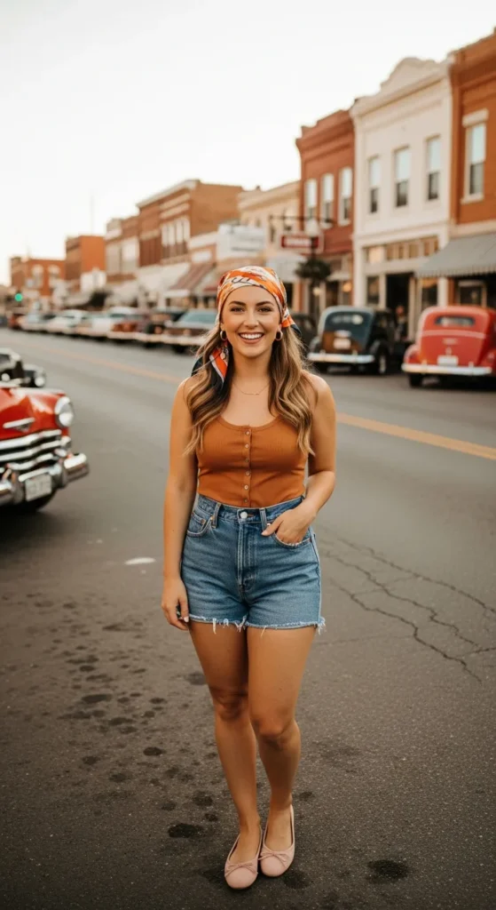 A button-front tank top styled with vintage-inspired denim shorts and soft blush ballet flats creates a nostalgic summer feel with a modern twist.
