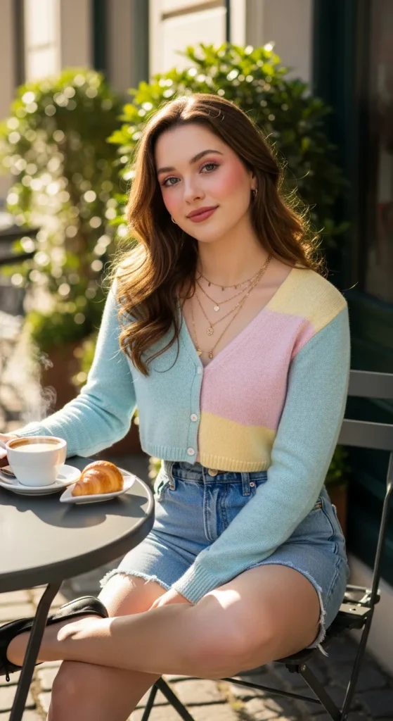 A pastel cropped cardigan paired with high-waisted denim shorts and classic black ballet flats gives off a soft, romantic summer aesthetic. It feels cozy yet light, perfect for cooler mornings.