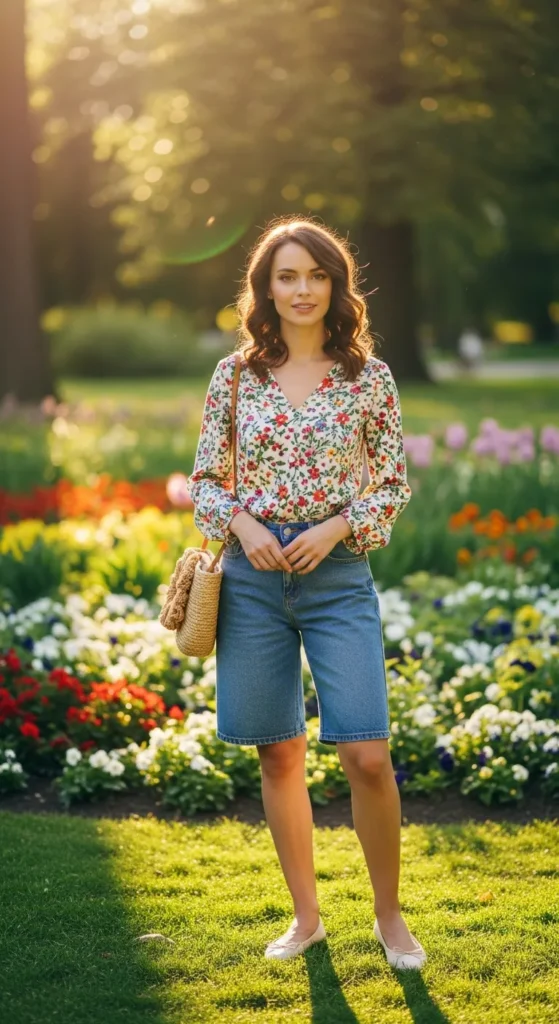 A lightweight floral blouse tucked into soft denim shorts with cream ballet flats creates a dreamy, feminine outfit perfect for summer days. It feels soft, romantic, and easygoing.