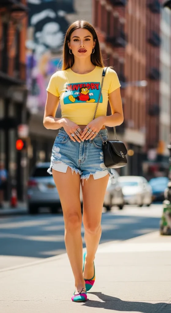 A fitted graphic baby tee with slightly distressed denim shorts and colorful ballet flats brings a playful, youthful edge to your summer wardrobe. It’s casual but still expressive and fun.
