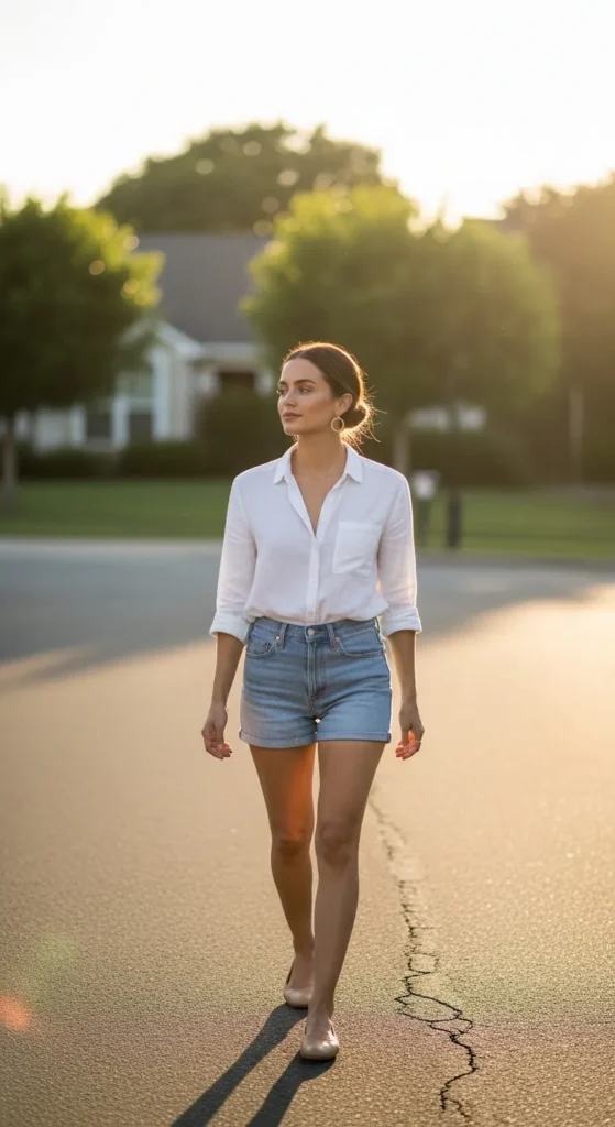 An oversized striped shirt worn loosely over relaxed denim shorts with neutral ballet flats feels effortless and chic. It’s the kind of outfit you throw on and still look instantly styled.
