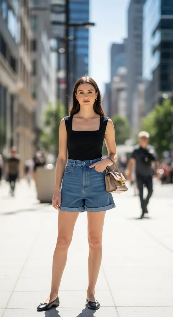 A square neck fitted top with tailored denim shorts and sleek ballet flats creates a structured yet soft outfit that feels elevated without effort.