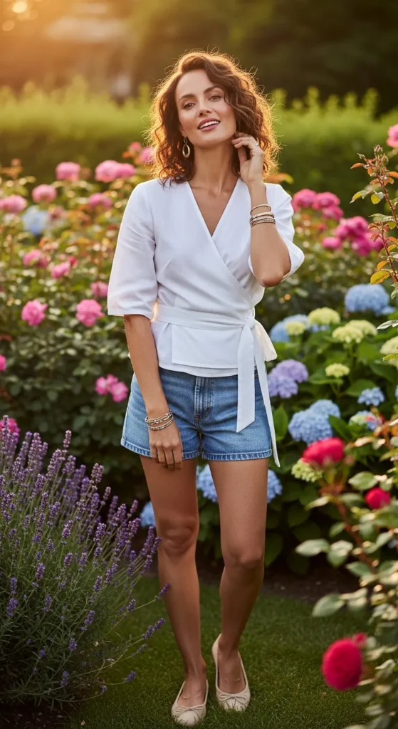 A soft wrap top paired with light denim shorts and ballet flats creates a flattering, feminine silhouette that hugs in all the right places.