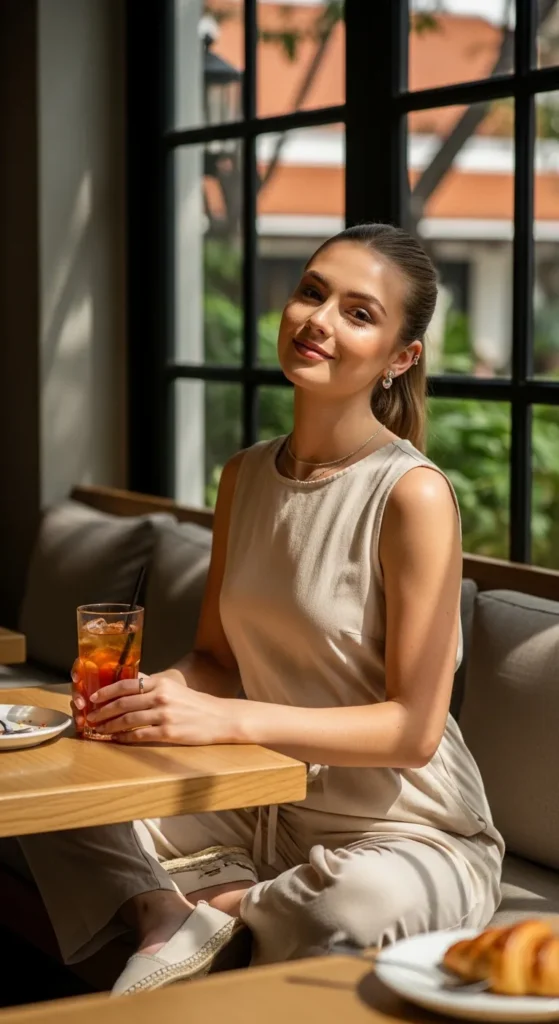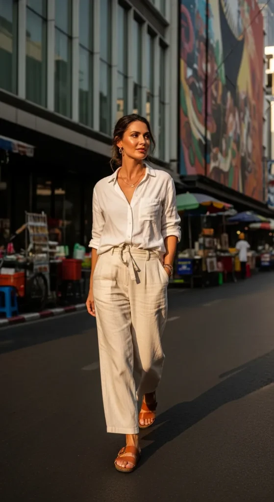 This combination keeps you cool while offering a flattering silhouette. The linen pants provide airflow, while the crop top adds a modern, youthful edge.