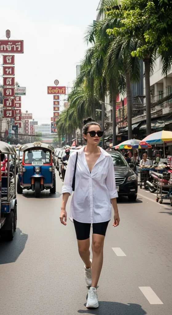 This look balances comfort and street style perfectly. An oversized cotton shirt over fitted biker shorts keeps things breathable while giving a modern, laid-back silhouette that works for city exploring.