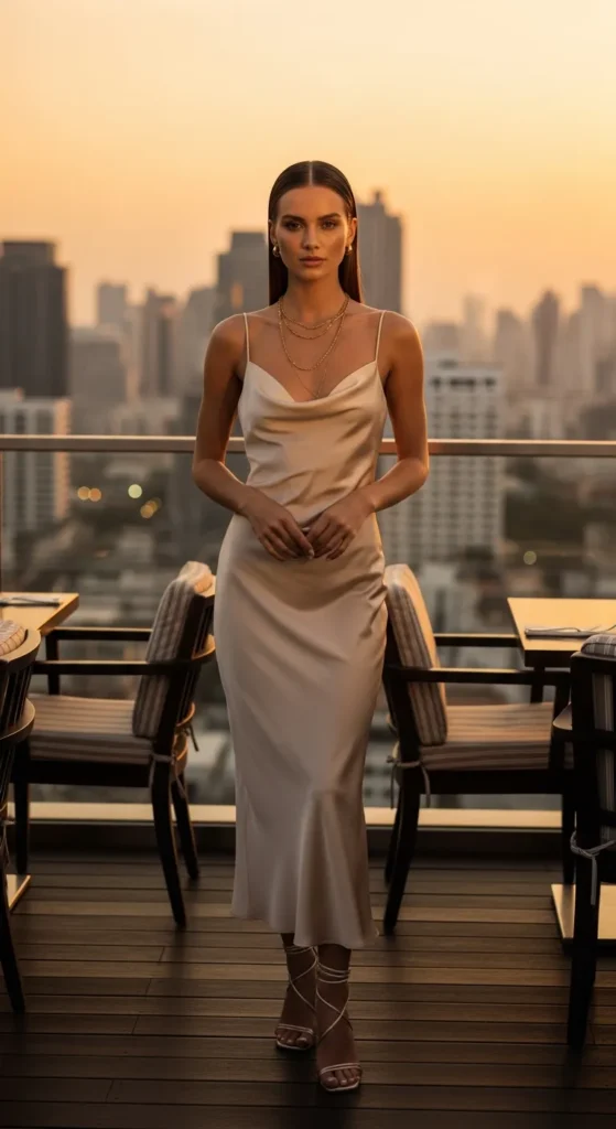 A lightweight satin slip dress glides over the skin, making it perfect for evening dinners in Bangkok. It feels elevated yet breathable, ideal for transitioning from day to night.