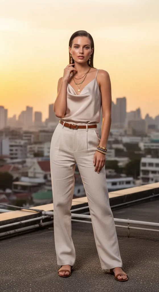 A silk camisole paired with linen trousers balances softness and structure, making it ideal for both daytime and evening plans.
