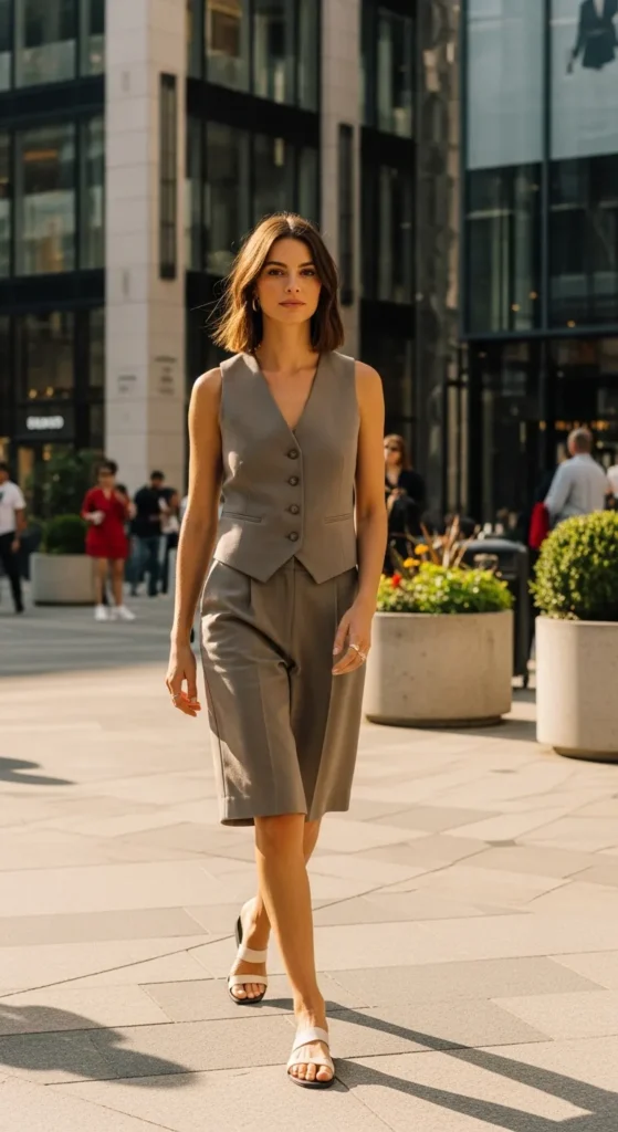 A casual button-up vest paired with Bermuda shorts feels fresh and fashion-forward without being intimidating. It’s a great way to try something new while staying comfortable.