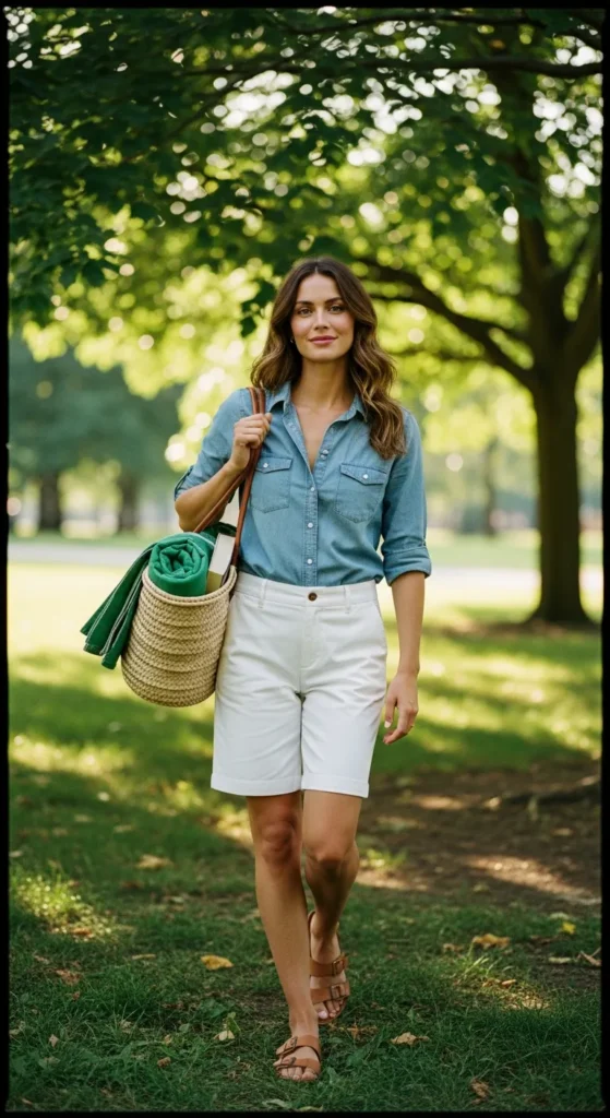 A chambray shirt paired with white Bermuda shorts feels crisp and summer-ready. It’s light, approachable, and perfect for warm afternoons outdoors.