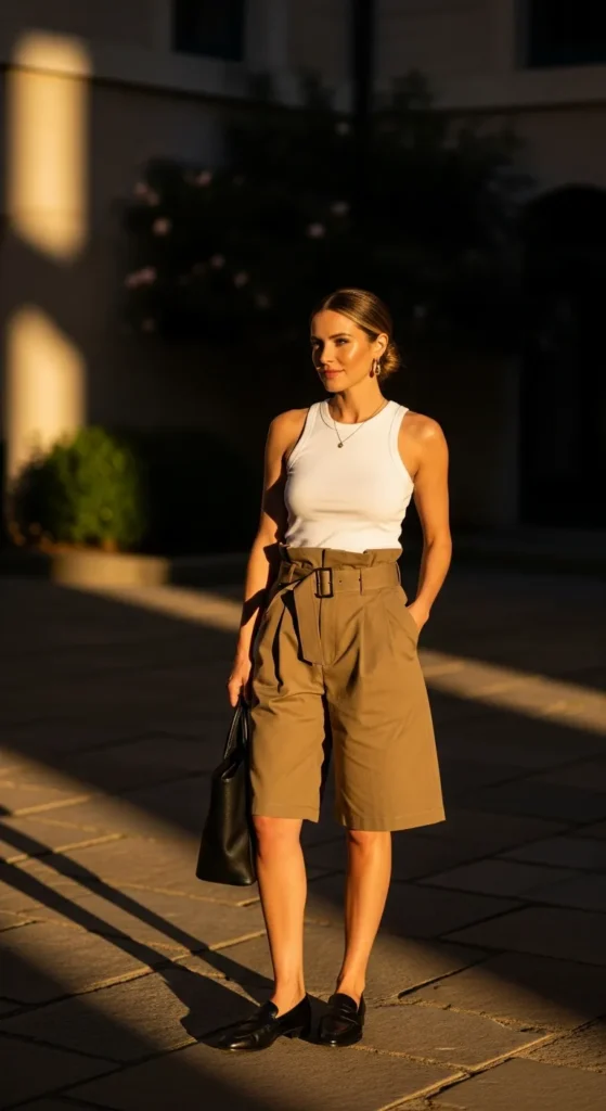 A fitted white tank paired with belted Bermuda shorts feels clean, confident, and timeless. It’s minimal but powerful, letting strong basics and thoughtful proportions do all the styling work.