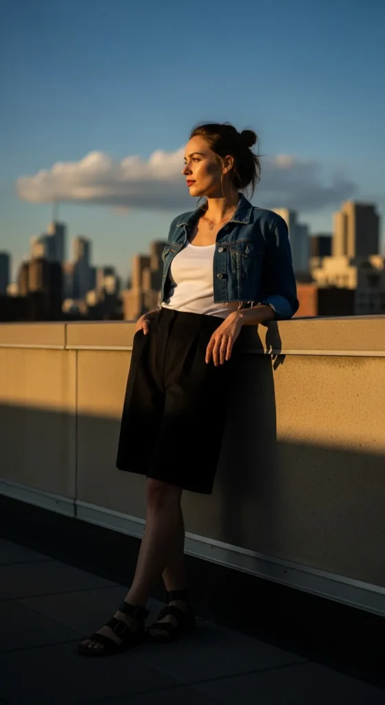Black Bermuda shorts paired with a cropped denim jacket create a confident, city-ready summer outfit. It feels bold yet practical, perfect for cooler mornings or evenings without heavy layering.