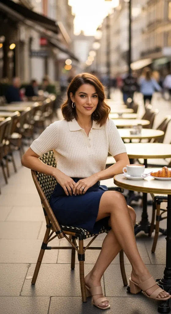 A lightweight knit polo paired with high-rise Bermuda shorts feels quietly stylish and grown-up. It’s soft, breathable, and ideal for days when you want comfort without losing that put-together feeling.