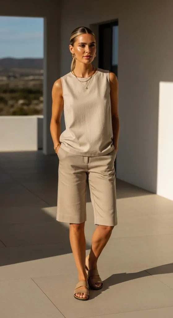 A fitted ribbed top paired with earth-tone Bermuda shorts feels grounded and stylish. The textures add interest while keeping the outfit approachable and perfect for everyday summer routines.
