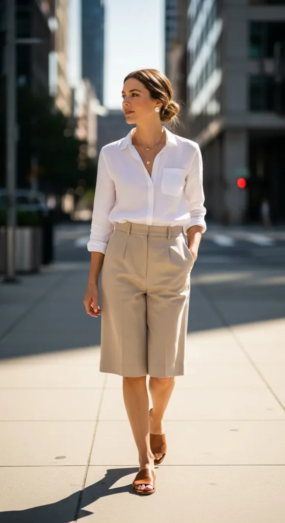 A breezy linen shirt tucked into tailored Bermuda shorts creates a relaxed yet refined summer outfit. It feels effortless, airy, and perfect for warm days when you still want structure and confidence.
