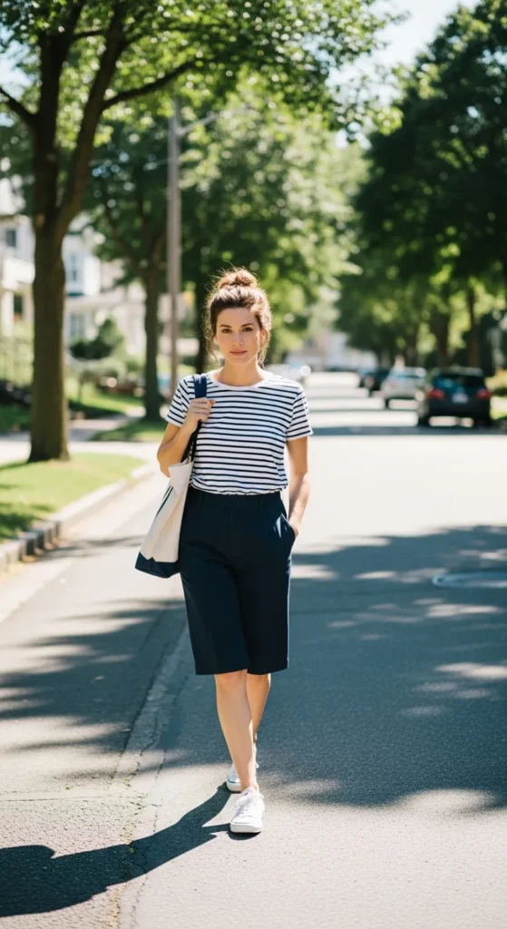 A striped tee with navy Bermuda shorts feels timeless and fresh. It’s a no-fail summer combination that always looks clean, comfortable, and easy to wear.