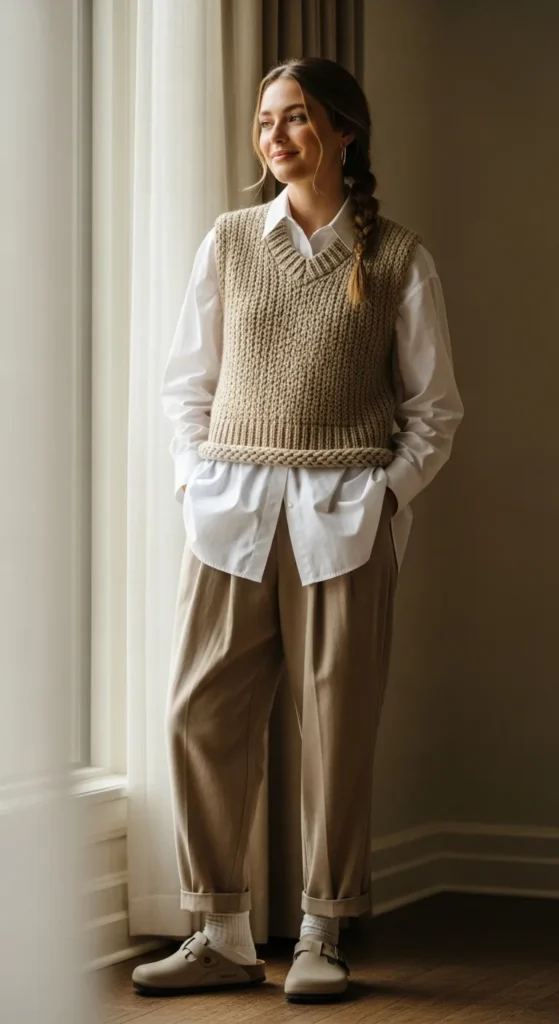A crisp button-up layered with a knit vest feels cozy yet smart. Birkenstock clogs soften the look, making it perfect for everyday wear.