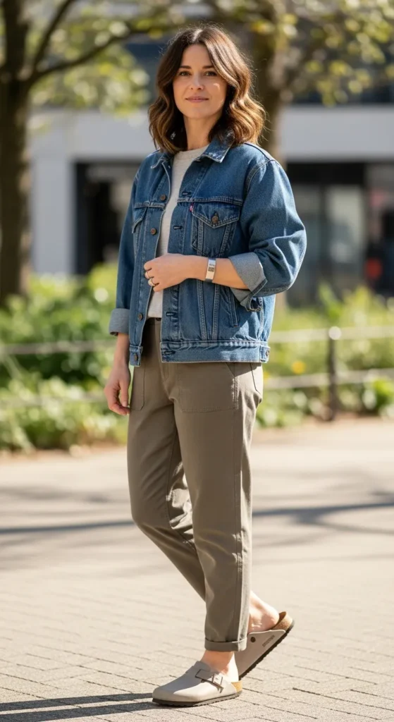 A classic denim jacket layered over soft basics feels timeless. Birkenstock clogs add comfort and make the outfit perfect for long days out.