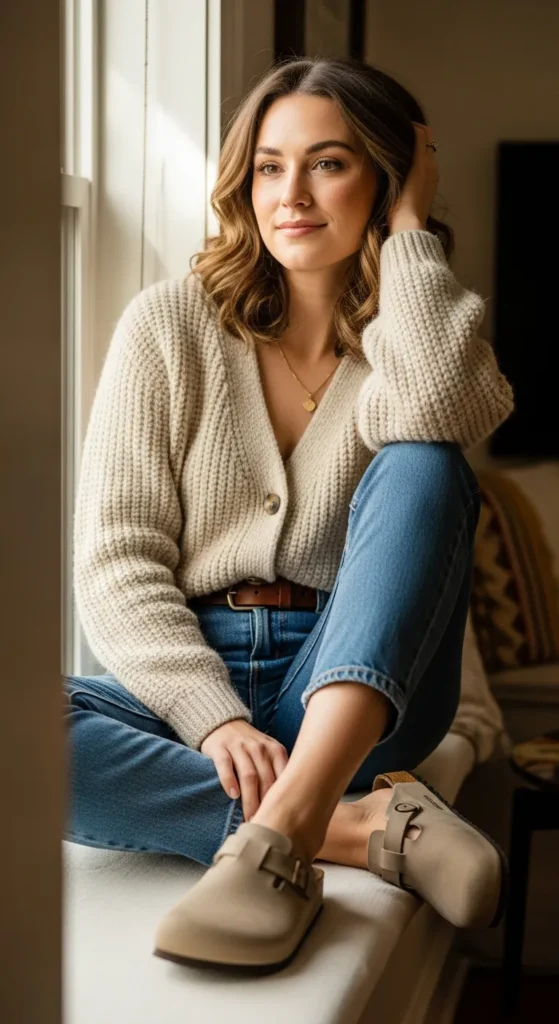 A slouchy cardigan paired with classic blue jeans feels timeless and warm. Birkenstock clogs add a relaxed, homey feel perfect for casual afternoons or study sessions.