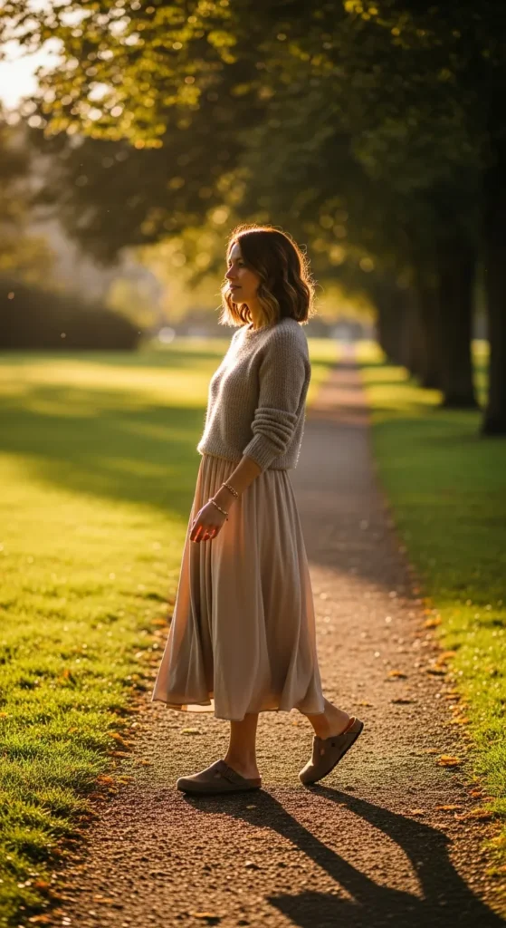 A flowy midi skirt with a lightweight sweater creates a gentle contrast between softness and structure. Birkenstock clogs keep the outfit grounded and wearable all day.