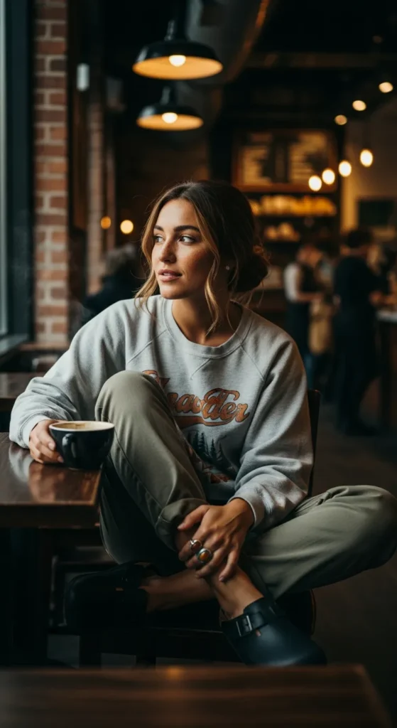 A graphic sweatshirt with straight-leg pants feels youthful and relaxed. Birkenstock clogs balance the casual energy with comfort-driven style.