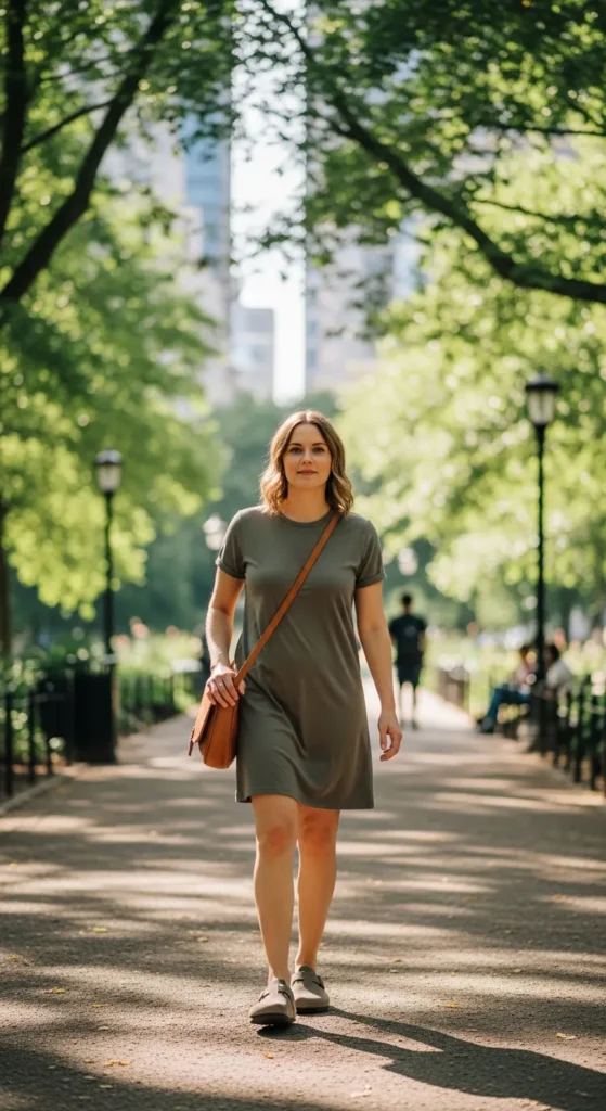 A simple tee dress paired with Birkenstock clogs feels effortless and comfortable. It’s a no-fuss outfit that still looks styled.
