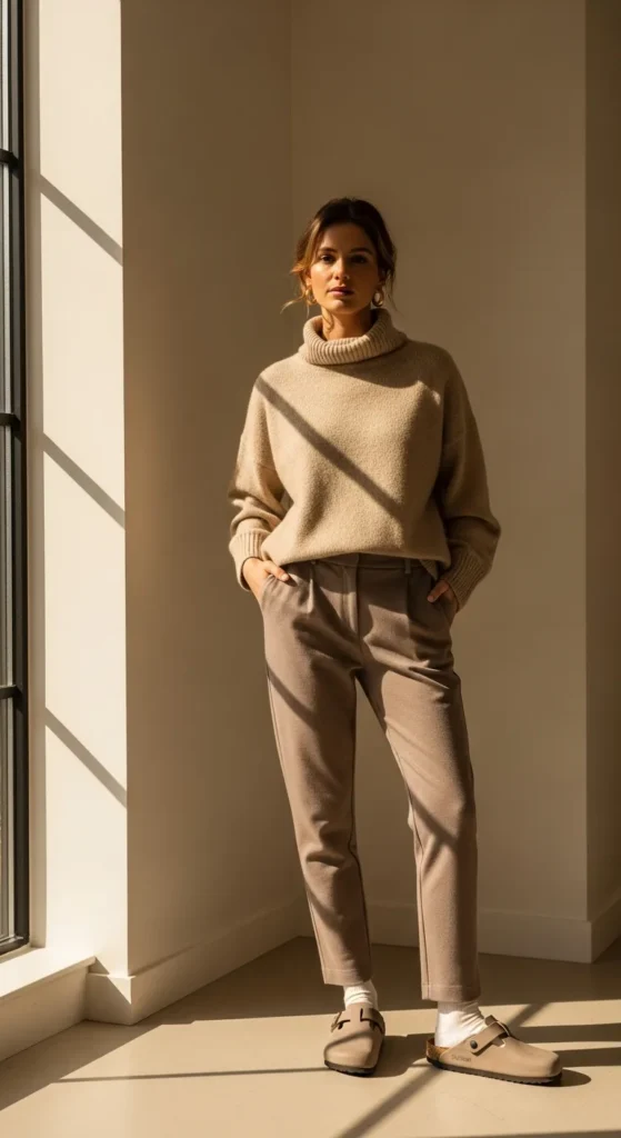 A fitted neutral turtleneck with relaxed trousers feels cozy and clean. Birkenstock clogs complement the understated elegance.