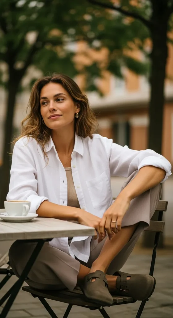 A loose linen button-up layered over a fitted tank with soft trousers feels breathable yet cozy. Birkenstock clogs keep the look grounded and comfortable for transitional weather days.