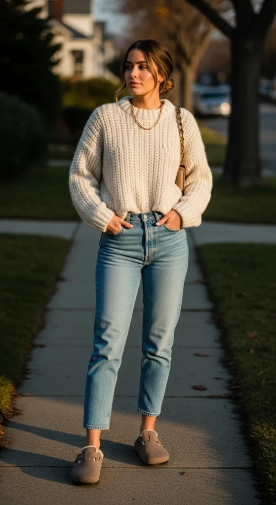 A chunky cream knit sweater paired with relaxed straight-leg jeans creates an easy, comforting silhouette. Cozy Birkenstock clogs ground the look, perfect for slow morning walks or casual coffee runs.