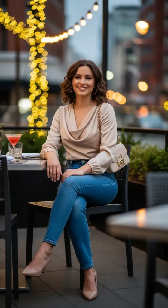 A silky draped top paired with flattering high-waisted jeans is the perfect balance of casual and glam. It feels comfortable yet stylish enough for a relaxed birthday dinner with friends.