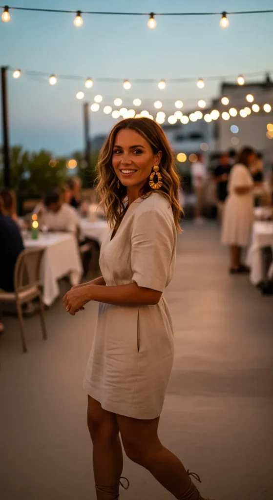 A tailored linen mini dress gives off effortless summer elegance. The breathable texture keeps the outfit relaxed while the shorter silhouette adds a playful, celebratory vibe that’s perfect for birthday photos.