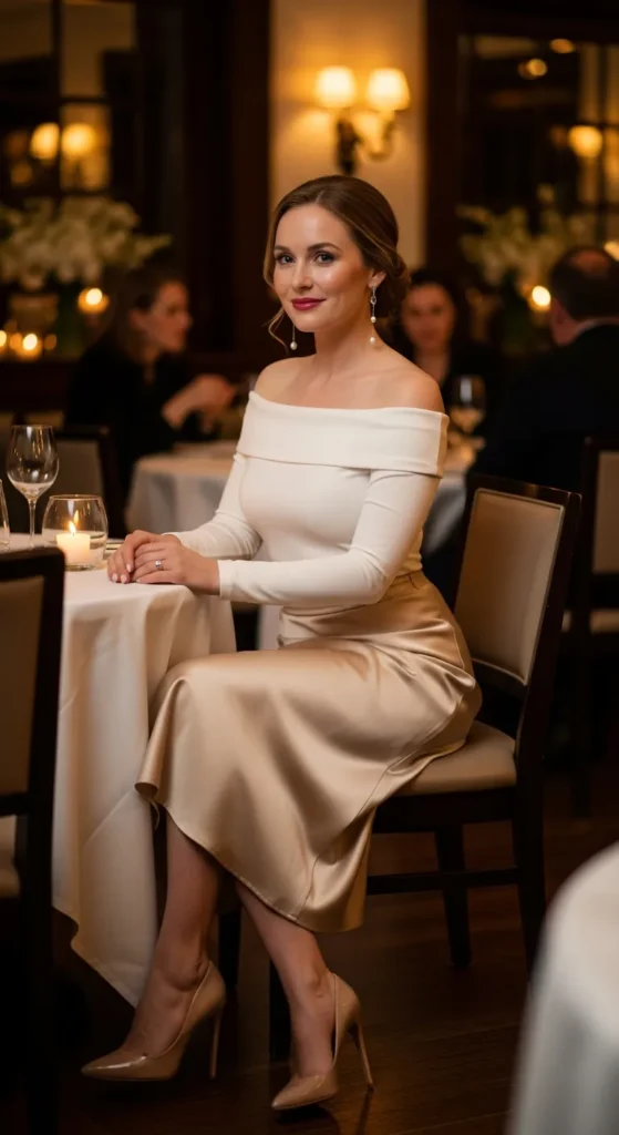 An off-shoulder top paired with a flowing satin midi skirt creates a romantic birthday dinner look. The exposed shoulders add softness while the glossy skirt moves beautifully as you walk through a summer evening.