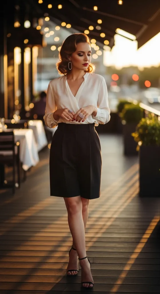 A lightweight sheer blouse tucked into tailored high-waisted shorts creates a playful yet polished birthday dinner outfit. The soft transparency adds a hint of glamour while the structured shorts keep everything refined.