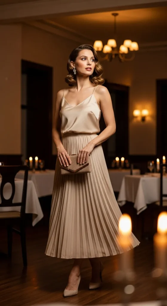 A silky camisole paired with a pleated midi skirt creates graceful movement that feels beautiful for evening celebrations. The look is feminine, polished, and effortlessly chic.