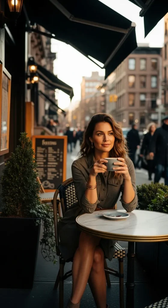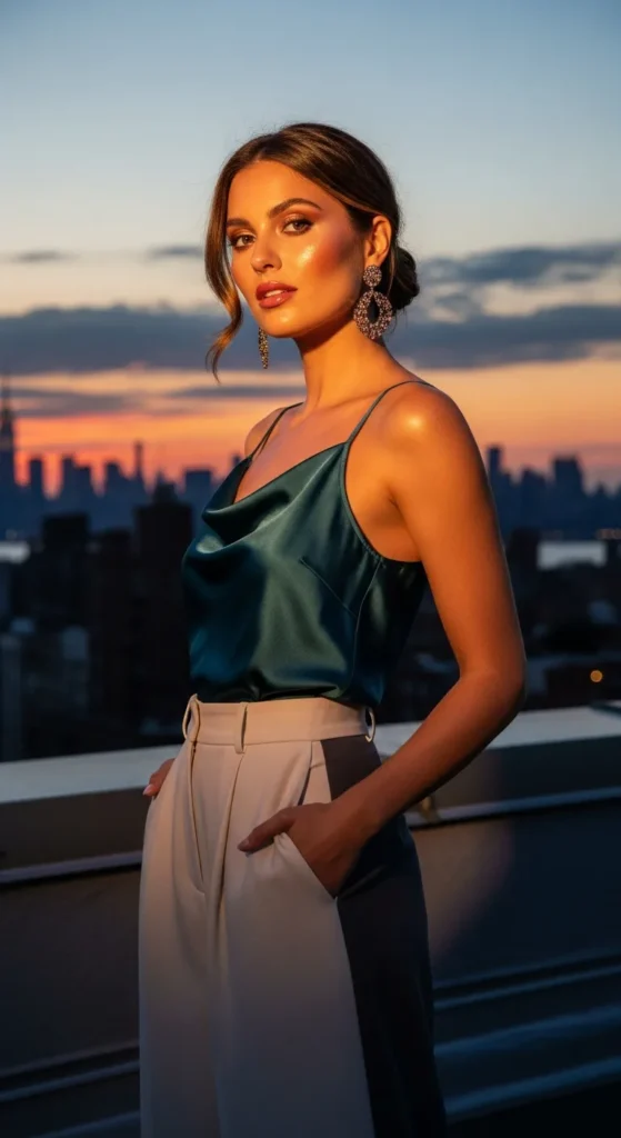 This look feels effortlessly sophisticated. A silk camisole paired with wide-leg pants creates a flowing silhouette that’s both comfortable and elevated.