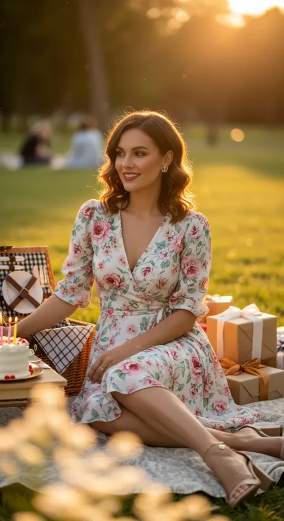 A floral wrap dress is timeless for summer birthdays. It cinches the waist naturally and flows with every step, creating a soft and feminine presence.