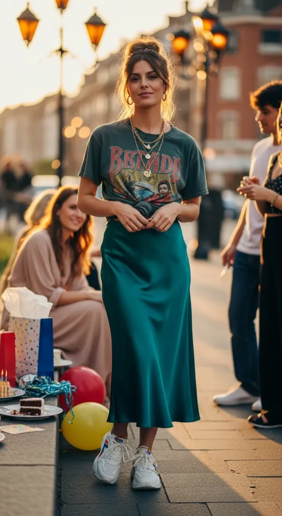 Mixing a casual graphic tee with a satin skirt creates a cool, unexpected contrast that feels modern and effortlessly stylish.