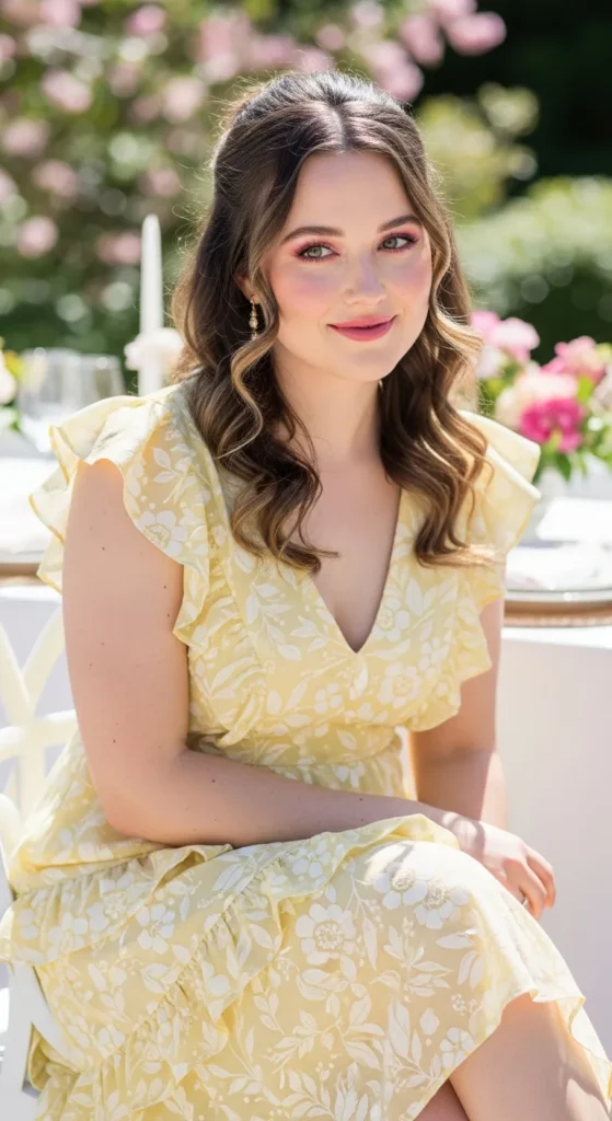 A tiered sundress offers volume and comfort, perfect for a relaxed daytime birthday celebration with a soft, carefree feel.