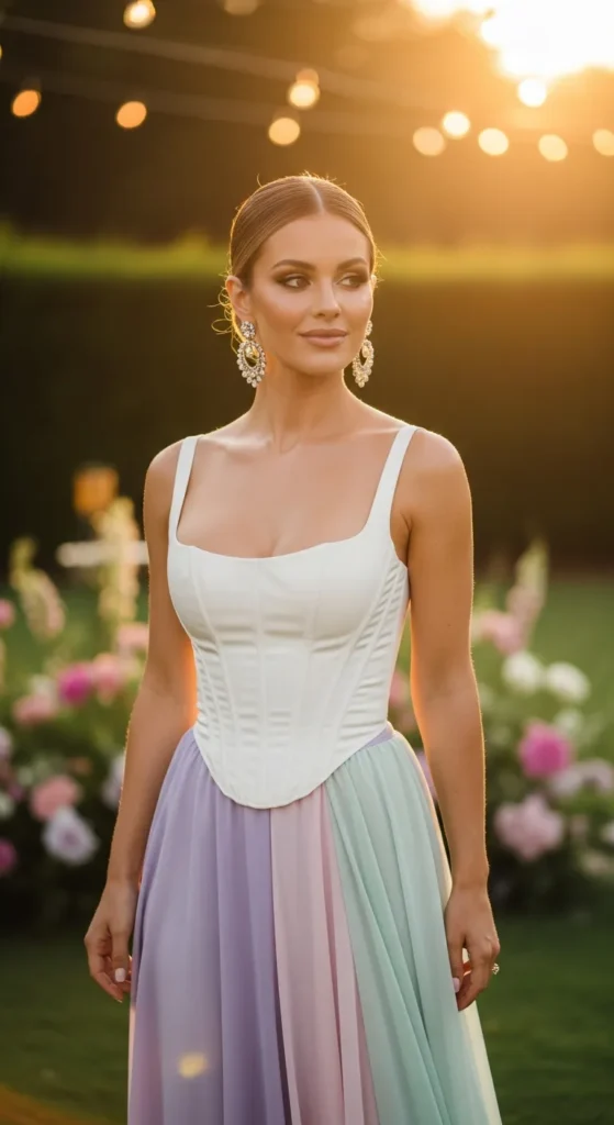 A structured white corset paired with a breezy maxi skirt blends femininity with structure. The contrast creates a dreamy yet confident silhouette perfect for a summer birthday celebration.