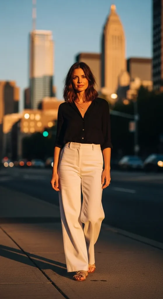 A black button up paired with white wide-leg pants feels strong, clean, and effortlessly stylish. It’s a summer outfit that works from day to night.