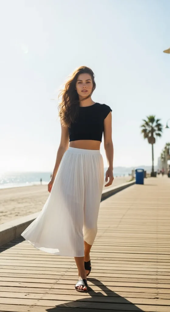 This pairing feels youthful and airy, perfect for hot summer days. The black crop top adds contrast while the white skirt moves beautifully with every step.