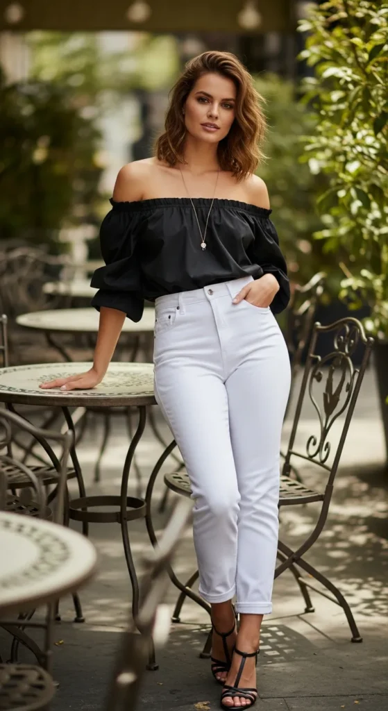 A black off-shoulder top paired with white denim feels playful yet confident. The exposed neckline adds softness while the structured jeans keep everything grounded and wearable.