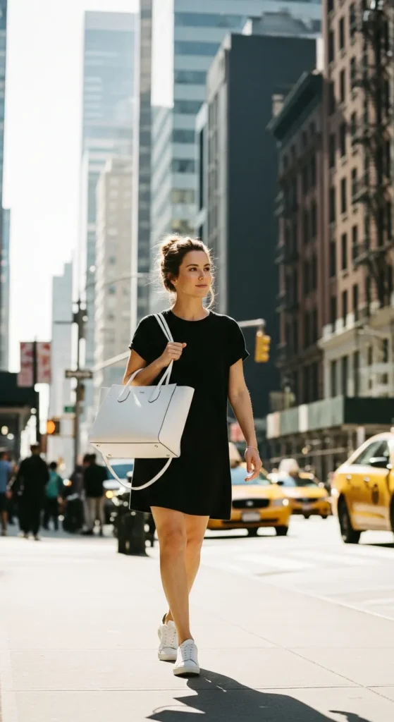 A black t-shirt dress feels effortless and comforting, especially when paired with a structured white tote. It’s an easy outfit that still feels intentional.