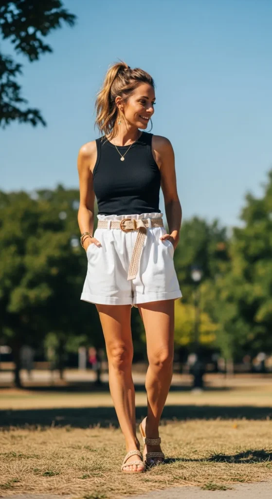 This outfit feels youthful and easy, perfect for casual outings. The white shorts brighten the look while the black tank keeps it balanced.