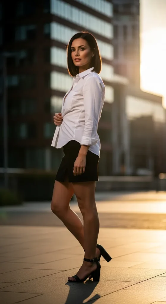 A classic white button-down tucked into a black mini skirt feels confident, modern, and endlessly versatile. It’s clean, flattering, and perfect for summer evenings.